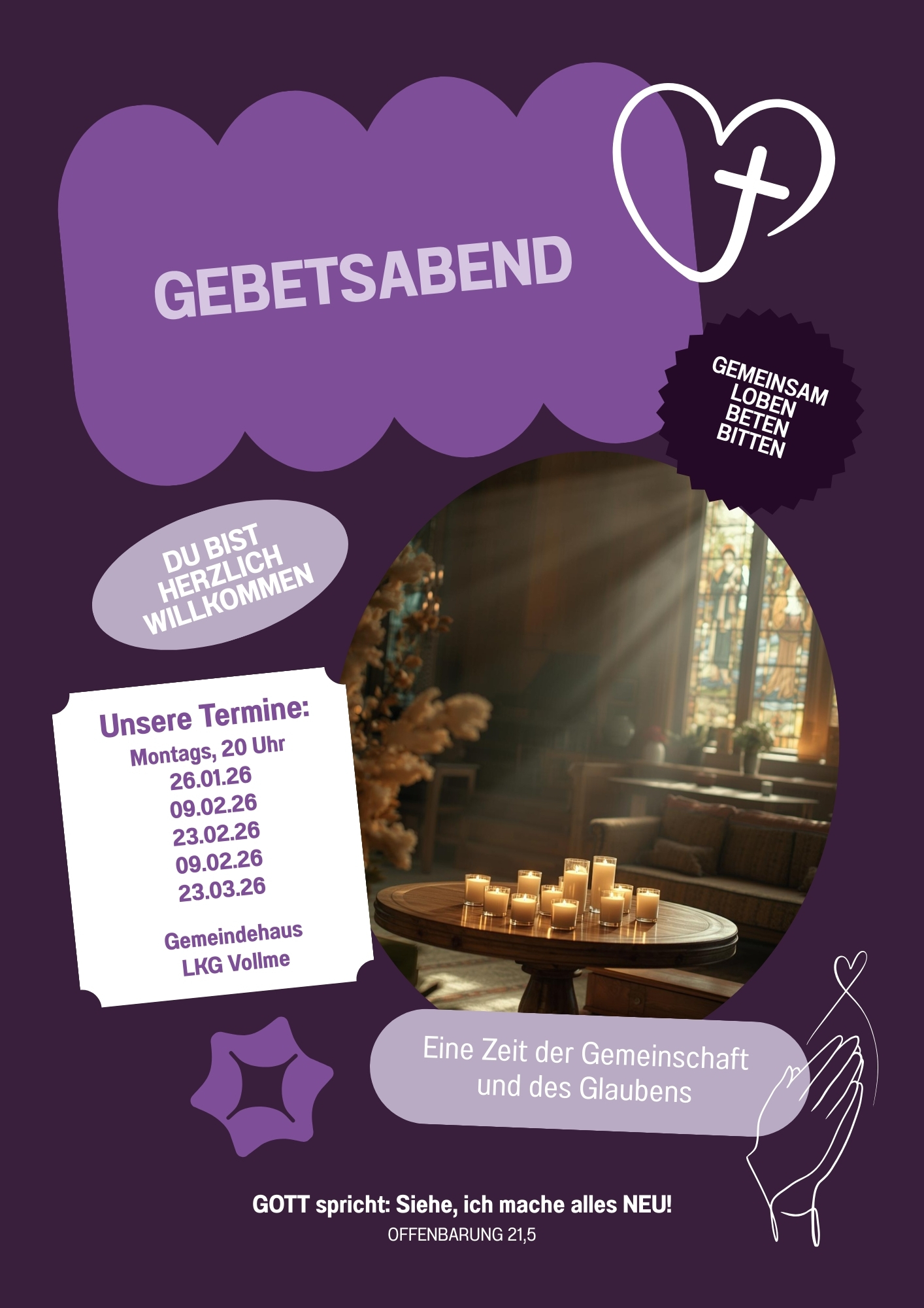 Wir treffen uns um 20 Uhr in unserem Gemeindehaus und beten gemeinsam.